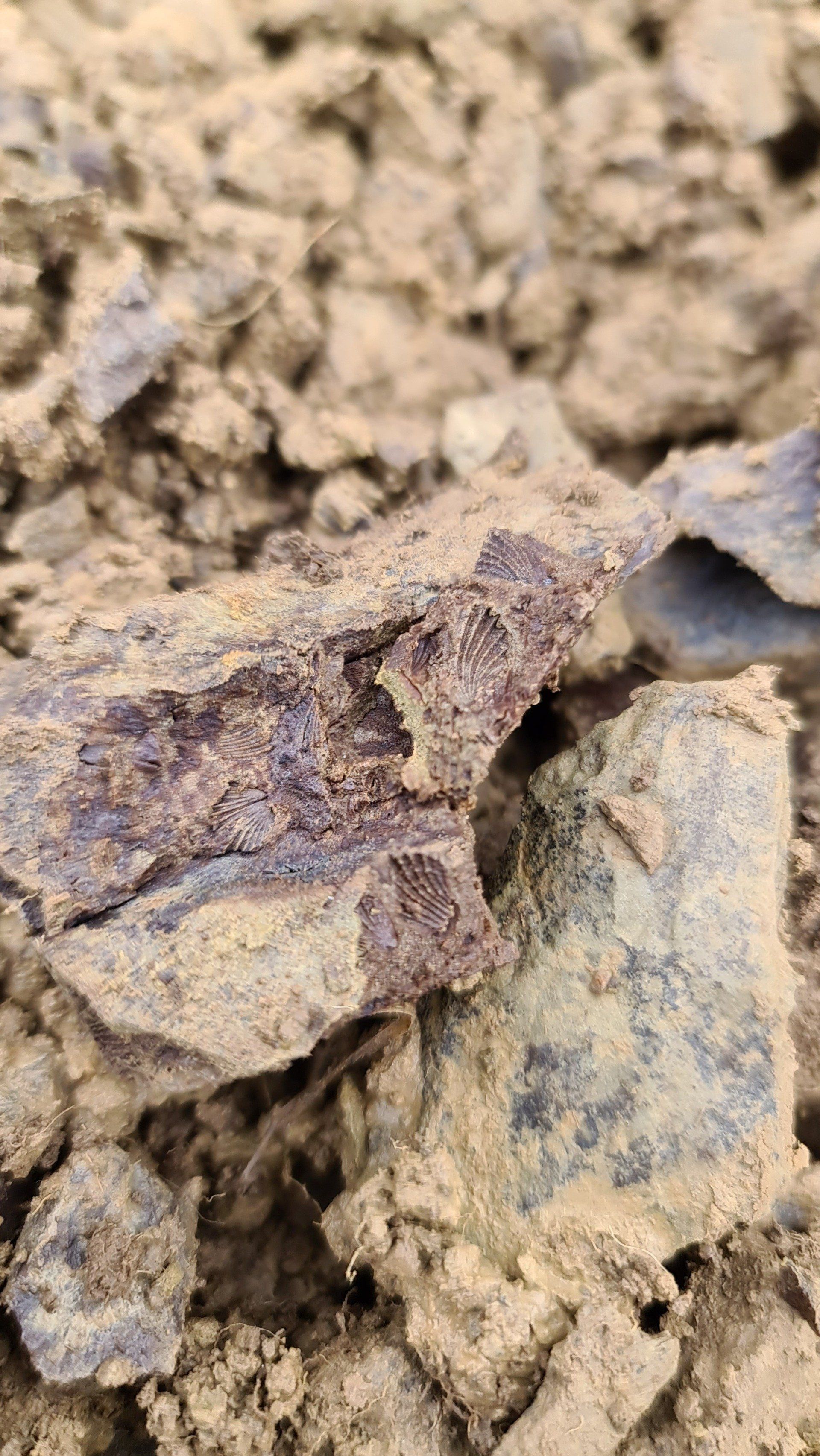 The Aymestry limestone and shales date from circa 420 million years ago and are some of the oldest limestones on the planet. It is scattered with brachiopod and occasional orthocone fossils. Pudford Hill was elevated and fractured during the rise of the East Malvern fault over 300 million years ago. Weathering and erosion has washed away superficial lime, but deeper down and at the lower spring sites, rich alkaline lime deposits can be found. Clays form as part of the weathering process and increase in their proportion to limestone from 1/3 above to 2/3 just below the vineyard. The limestone is particularly rich in magnesium, which is an essential element for healthy vines. The magnesium is as high as 1:2 compared to calcium, which is thought to be due to the more stable chemical formula of magnesium carbonate over time. This accounts for a slight pink hue in certain light conditions in a similar way to the Dolomites in Italy. Pictured here are Upper Southwood limestone brachiopod fossils from a shallow terroir pit in the Pinot Noir planting zone.