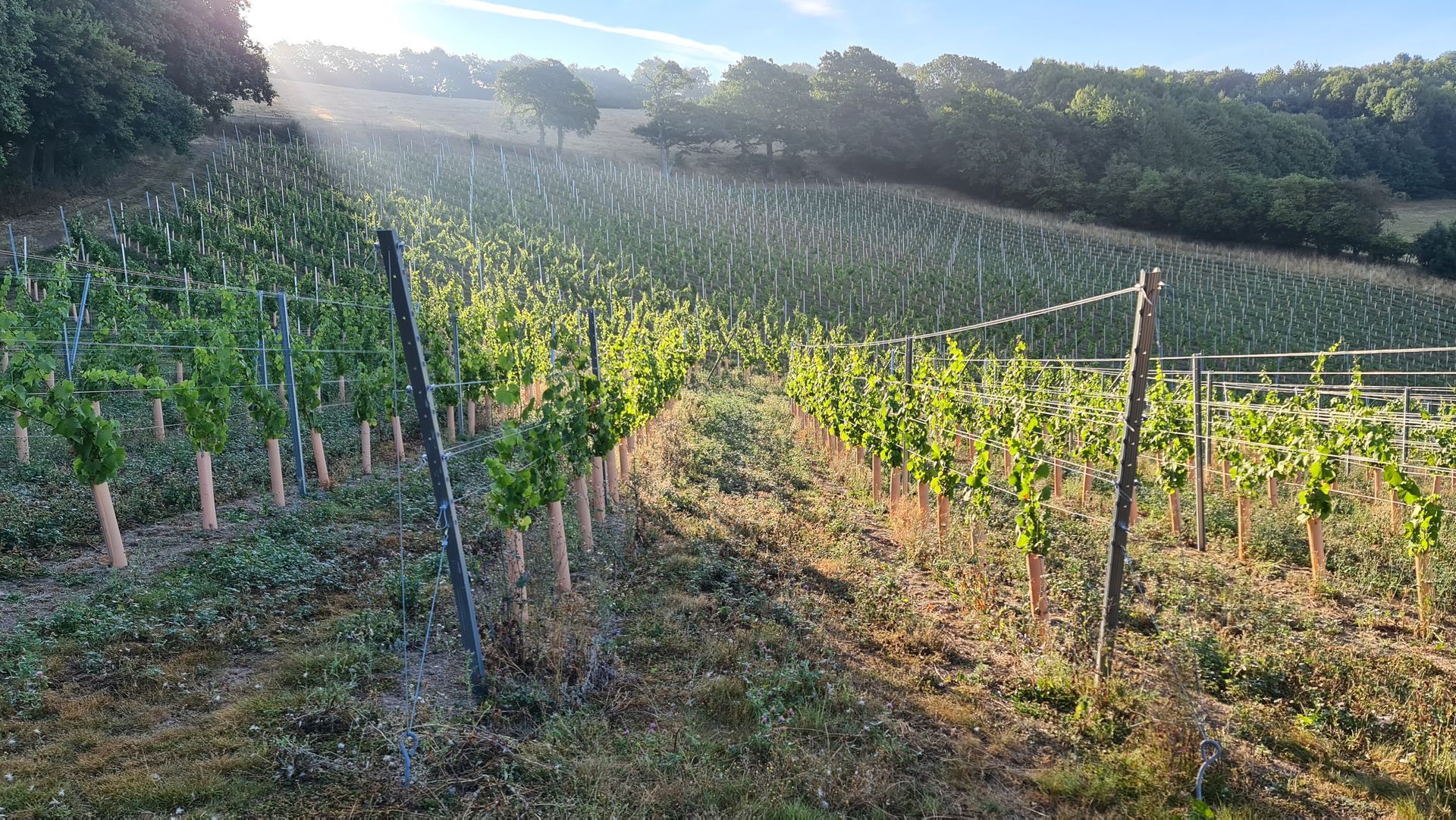 benefit from the good drainage it provides and are able to push their roots deep to access the water they need. The vineyard site has a 15 to 20 degrees incline to the South, which increases solar radiation and creates an warm microclimate. It is also protected from the cold North and Easterly winds by Pudford Hill and the strong prevailing Westerly winds by Southwood Rise. Pictured here is the vineyard in its second year during the hot and dry Summer of 2022 when the young vines thrived in the heat.